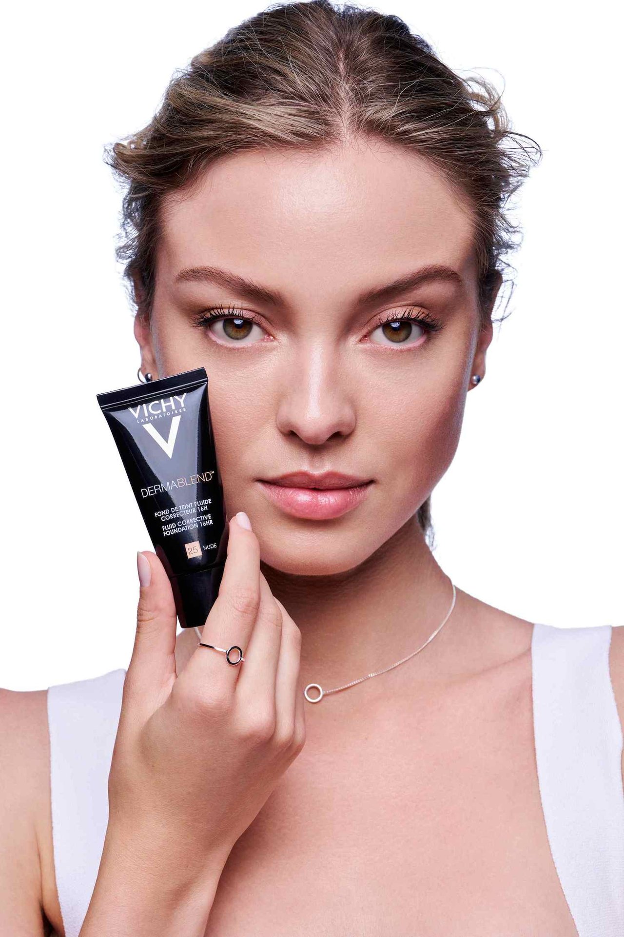 Comenzar aplicando una pequeña cantidad de base de maquillaje con las yemas de los dedos o con una brocha. Aplicar la base de maquillaje desde el centro del rostro hacia el exterior. Para disimular los problemas de piel más visibles, aplicar un poco de maquillaje en la zona afectada y extenderlo ligeramente. Difuminar hacia abajo en dirección al cuello, después hacia las orejas y hacia arriba en dirección a la línea del cabello. Repetir la aplicación hasta lograr la cobertura deseada. Prolonga la duración con polvos.